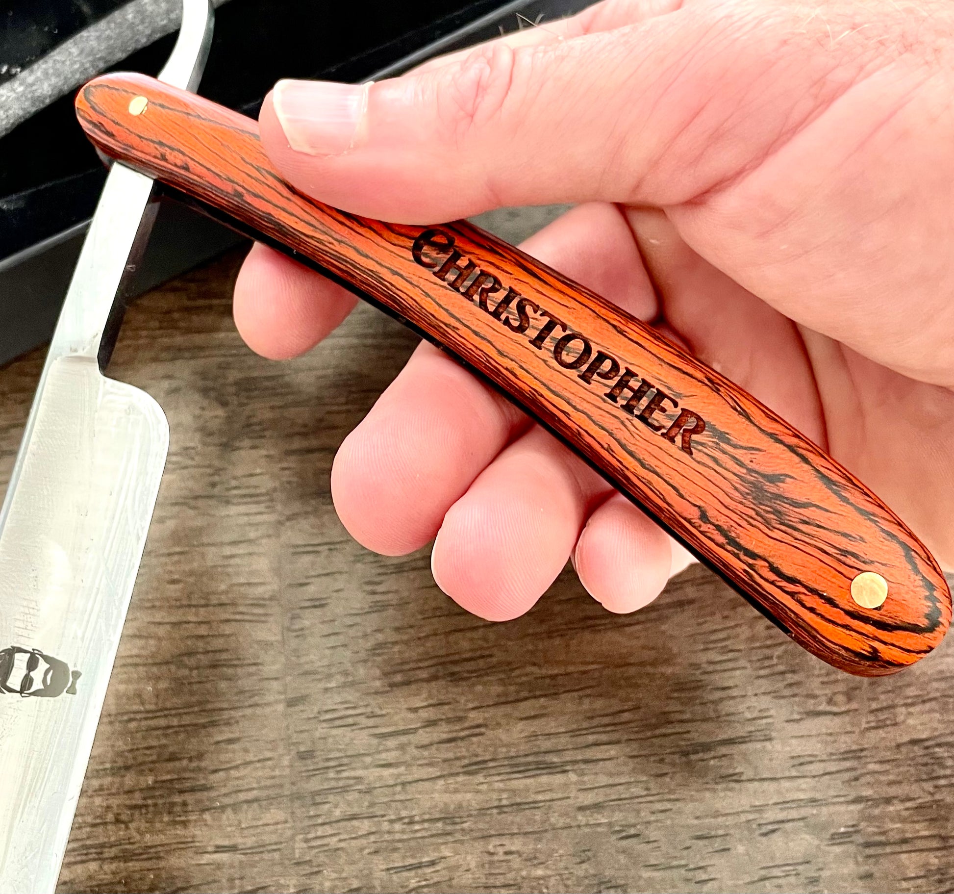 Your custom straight razor can be single or double-sided engraved with letters, numbers, or symbols.